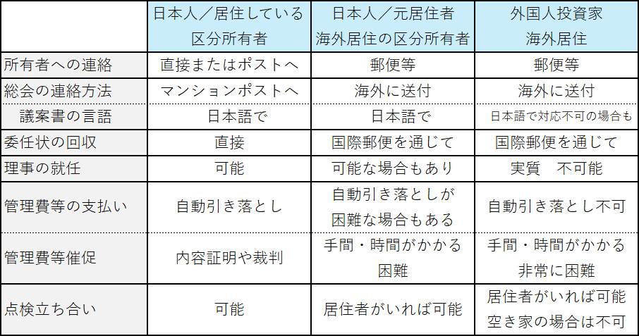 総会の出席も海外にいると、出席しにくくなります。時差もあり、オンラインでも参加が難しいことがあります。委任状や議決権行使書の提出も滞りがちになり、まして、日本語を解さない所有者もいます。管理費などの徴収も難しいのが現実です。日本に住所がないと、銀行の口座が開設できず、自動引き落としができません。滞納の催促も困難です。理事にはなかなかなってもらえないし、マンションに住んでいないので修繕の必要性も理解してくれず、修繕積立金の値上げもなかなか納得してくれません。また人が住んでいないと設備の点検に立ち合ってもらえない等があります。海外に住むという意味では共通点が多いのですが、管理への理解や関心という意味では、元居住の日本人区分所有者と海外に住む投資家では大きく違ってくるでしょう。