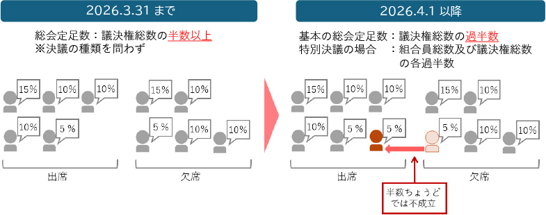 ポイント1今までの決議要件は、法律で「組合員総数および議決権総数の各4分の3以上」と定められていたので、規約もそうなっていることが多かったのですが、改正後は、法律では「総会に出席した組合員およびその議決権の各4分の3以上」に変更になるため、規約でも変更が必要になります。「総会に出席」には、議決権行使書や委任状も含みます。実務的には、当日の欠席者には、委任状ではなく、内容を確認して意思表示をする議決権行使書を出すように奨励していきましょう。出席者多数になったからこそ、一人一人が内容を確認し、意思表示をすることがますます重要になります。