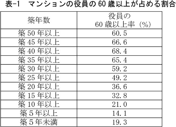 「平成30年度マンション総合調査」によりますと、世帯主の年齢は、60歳以上が49.2%となっています。特に、築年数の経ったマンションで高齢化が進行しており、役員の構成でみますと、60歳以上の占める割合は全体で41.9%ですが、築年数が30年になると59.2%、築年数が20年になると36.6%になっています。